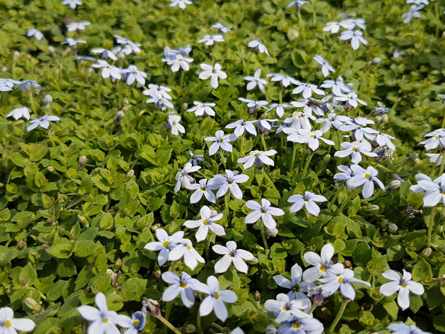 Der "Blaue Bubikopf" ist ein bezaubernder Bodendecker mit dichtem, teppichartigem Wuchs und himmelblauen Sternblüten.